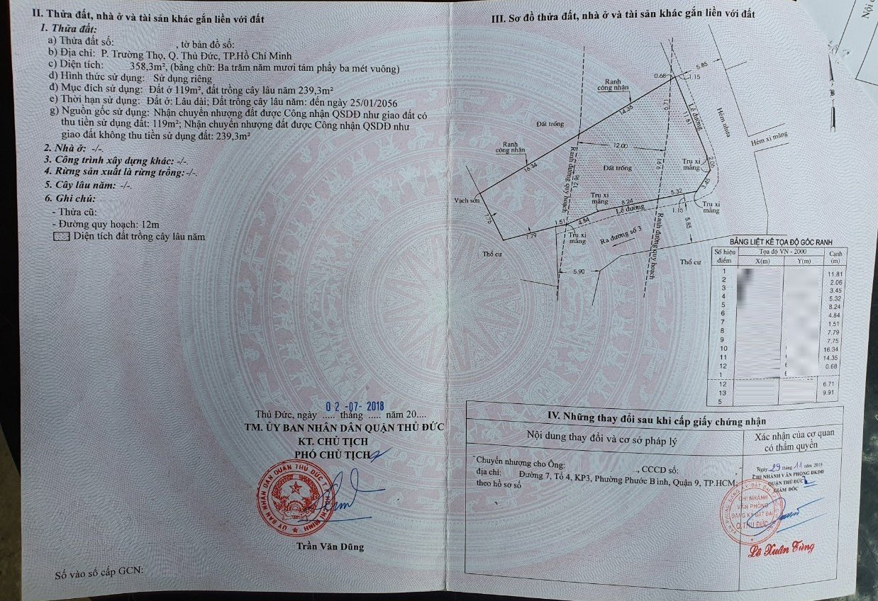 * Diện tích đất: 358.3m2 (ngang 12m x dài 30m) ODT: 119m2 CLN 239.3m2