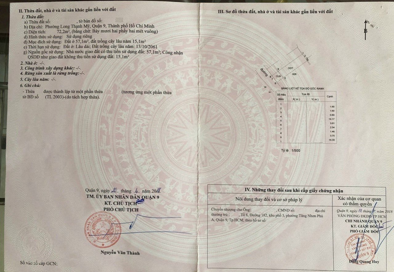 *Diện Tích đất công nhận: 72.2 m2 ngang 4 m x dài 18 m ODT: 57.1 m2 CLN: 15.1 m2