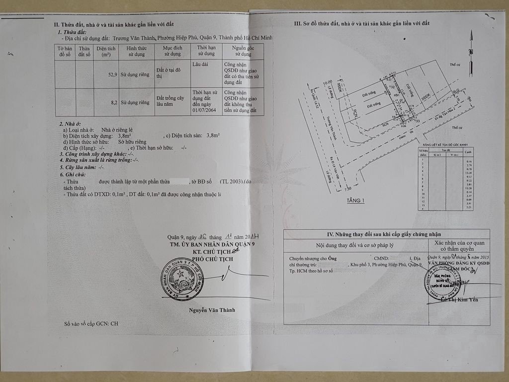 *Diện Tích đất công nhận: 61.1 m2 ngang 4 m x dài 15 m ODT: 52.9 m2 CLN: 8.2 m2