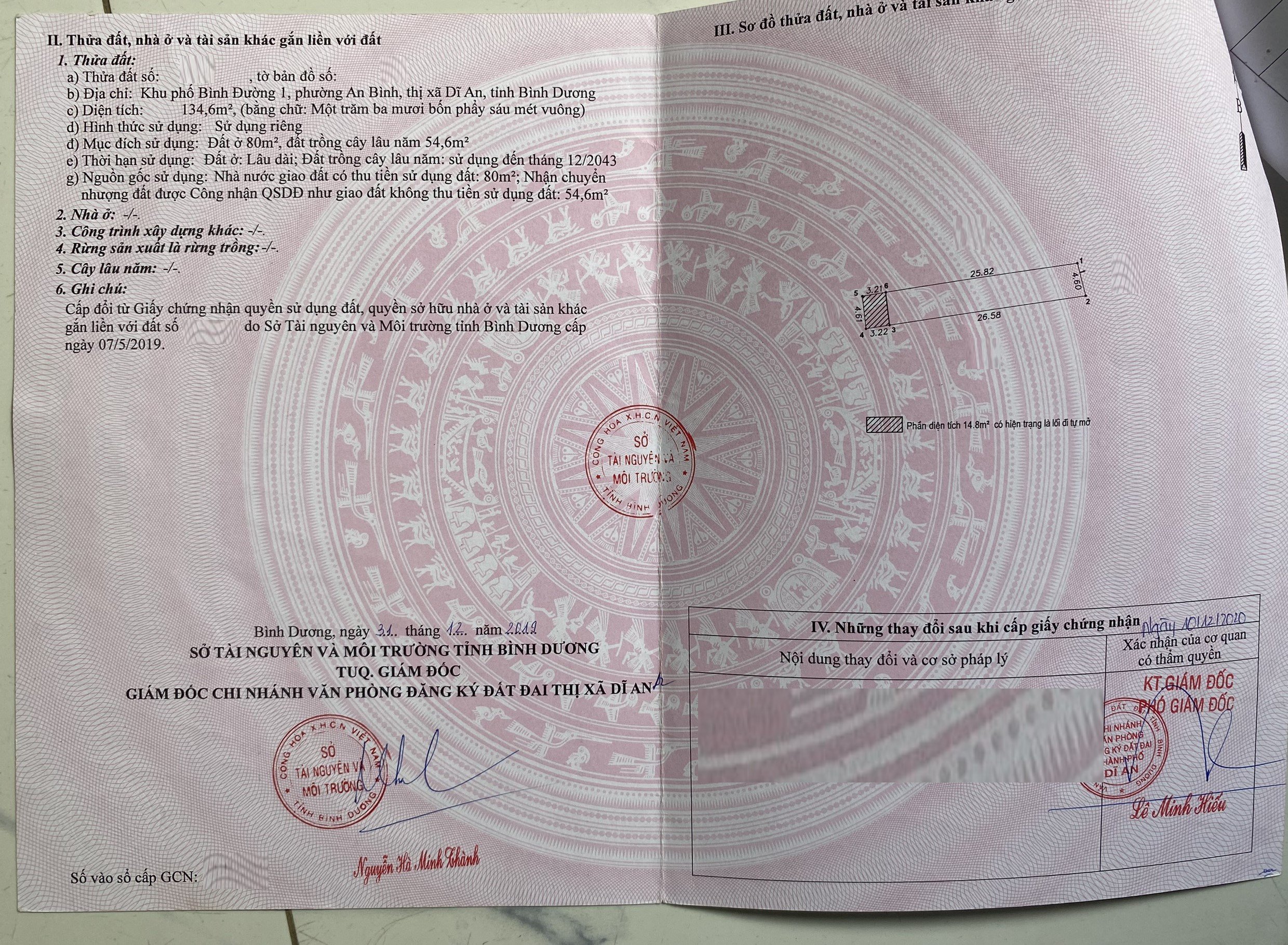 *Diện tích đất công nhận: 134.6m2. Ngang 4.61m x Dài 29m. ODT: 80m2, CLN: 54.6m2