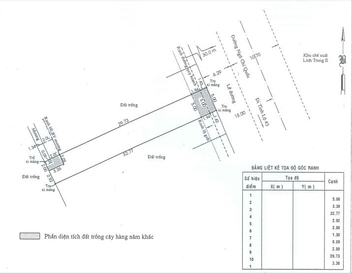 * Diện tích đất: 181.3m2 (ngang 5.30m x dài 32.72m) – đất ở: 157.7m2; đất trồng cây: 23.6m2