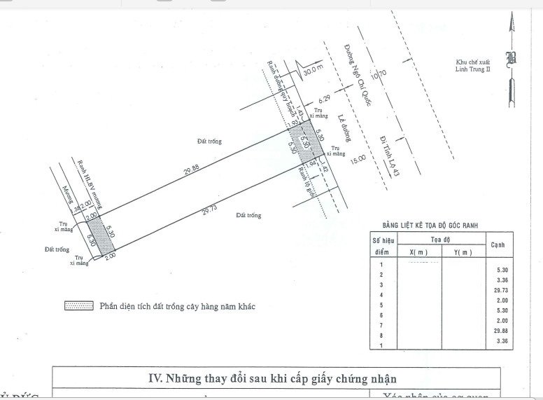 * Diện tích đất: 186.4m2 (ngang 5.30m x dài 29.88m) – đất ở: 158m2; đất trồng cây: 28.4m2