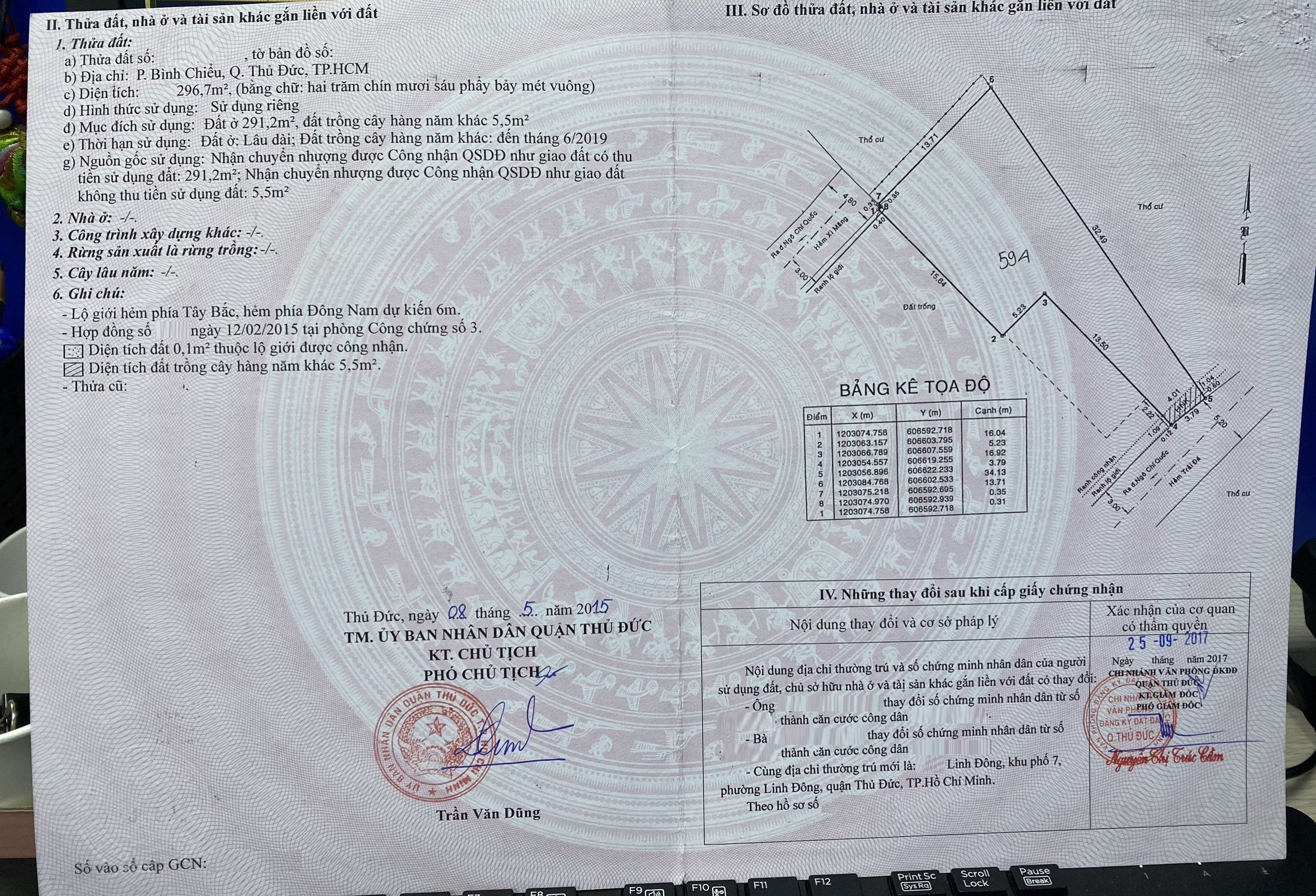 *Diện Tích đất công nhận: 296.7 m2 ngang 3.79m, nở hậu 13.71m ODT: 291.2m2 CLN: 5.5 m2
