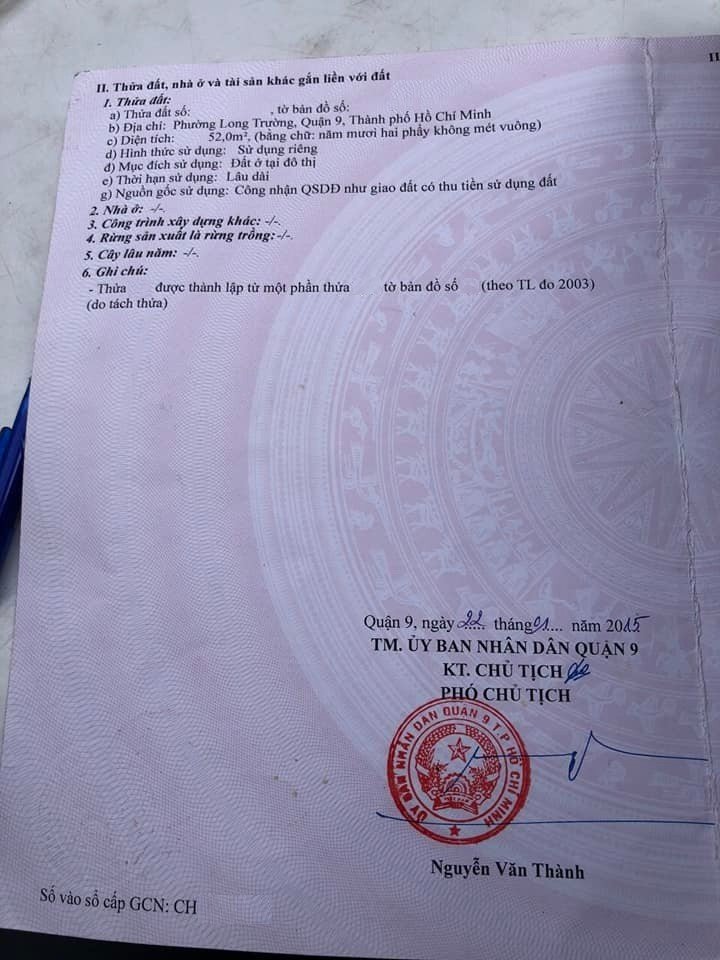 Địa chỉ tài sản: đường Nguyễn Duy Trinh,P Long Trường, Phường Long Trường, Quận 9, Hồ Chí Minh
