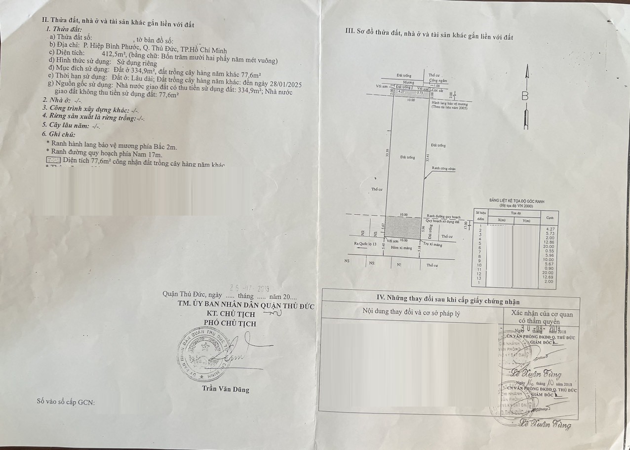 *Diện Tích đất công nhận: 412.5 m2 ngang 10 m x dài 41.2 m ODT: 334.9 m2 CLN: 77.6 m2