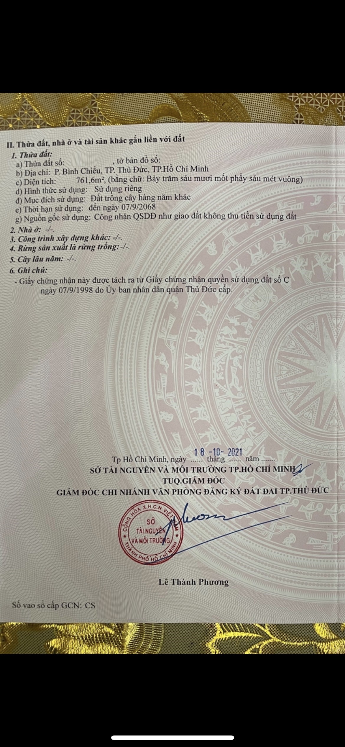 *Diện Tích đất công nhận: 761.6 m2 ngang 21 m x dài 36.3 m