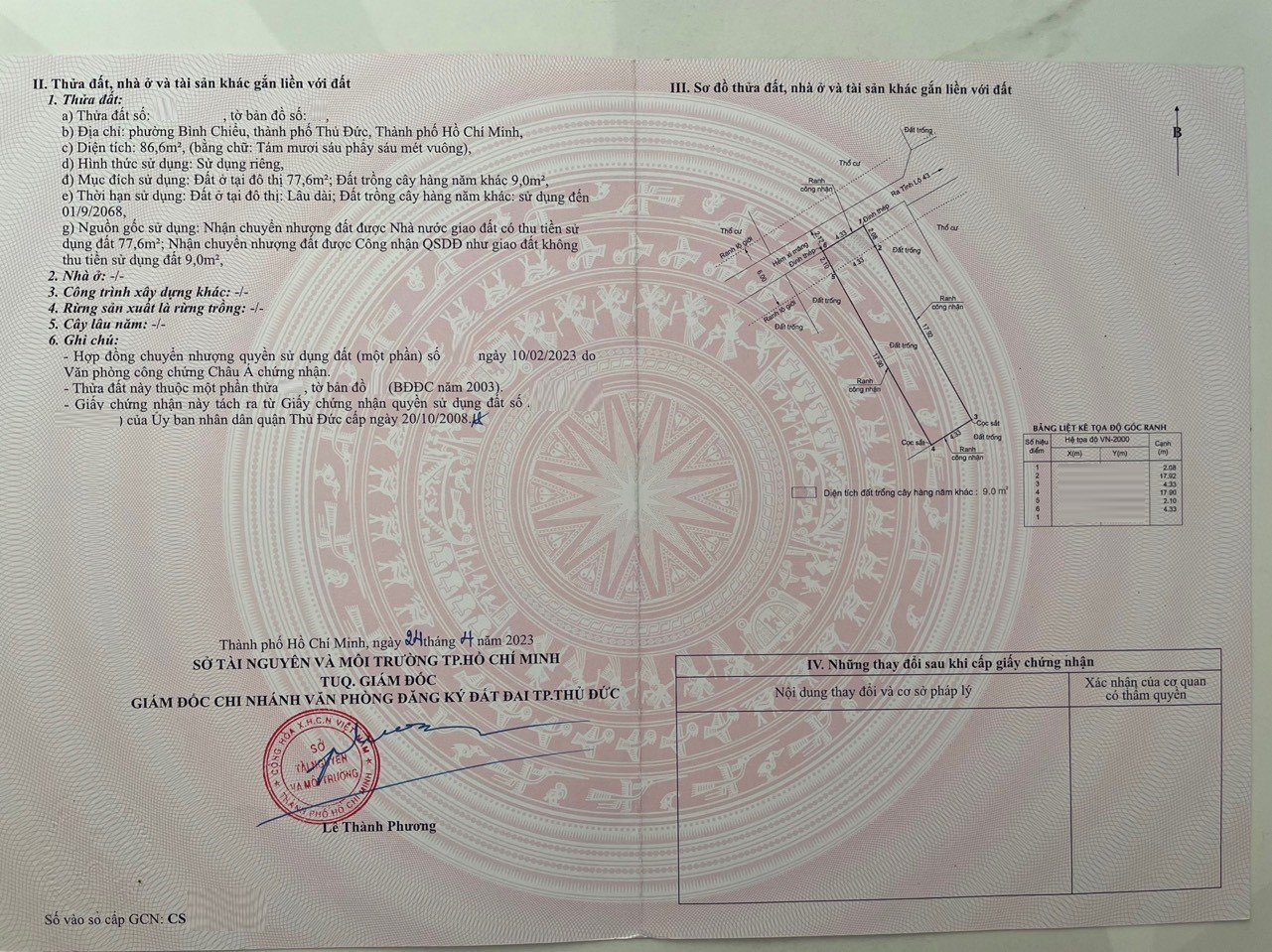 *Diện tích đất công nhận: 86.6m2. Ngang 4.33m x Dài 20m. ODT: 77.6m2, CLN: 9m2