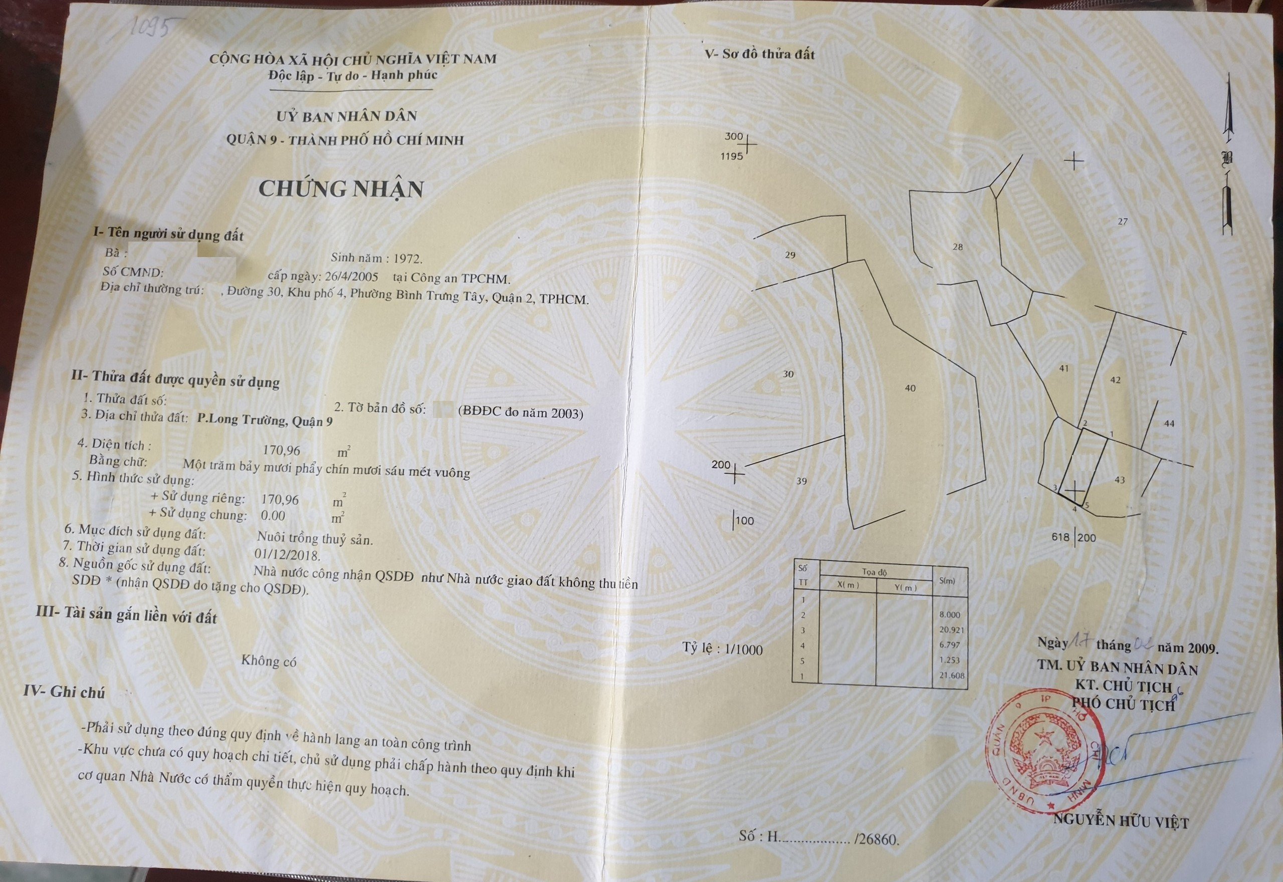 *Diện Tích đất công nhận: 170.96 m2 ngang 8 m x dài 21 m (đất nuôi trồng thủy sản)