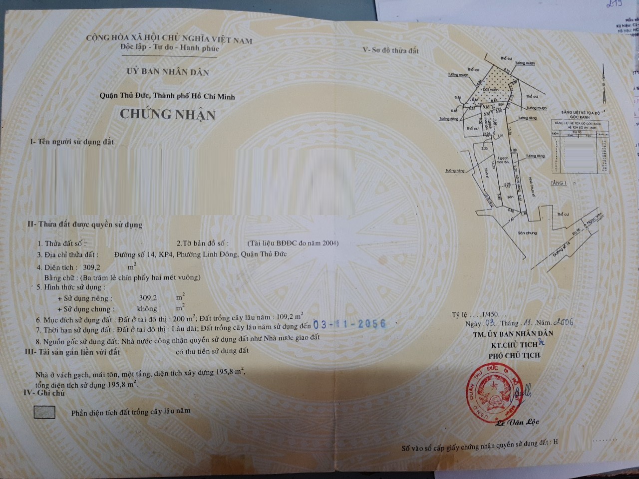 *Diện Tích đất công nhận: 309.2 m2 ( 200m2 đất ở – 109.2m2 CLN ) ngang 5m ở hậu