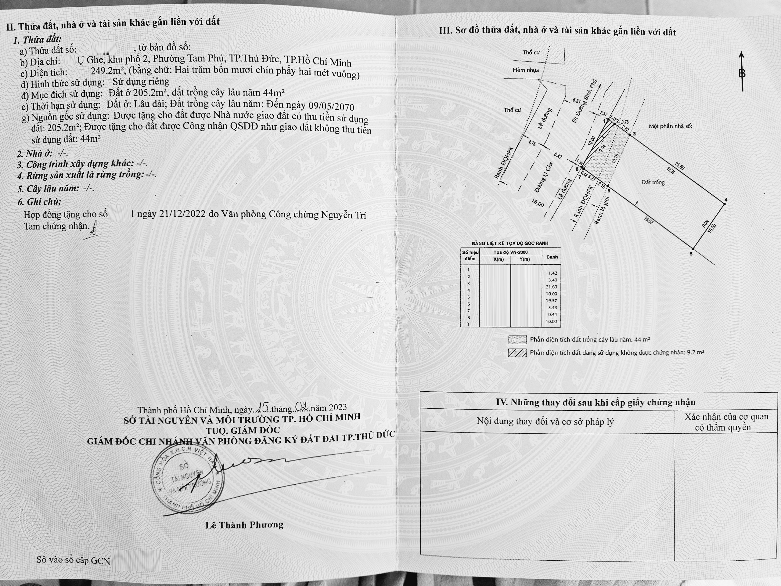 *Diện Tích đất công nhận: 249.2 m2 ngang 10 m x dài 25 m ODT: 205.2 m2 CLN: 44 m2