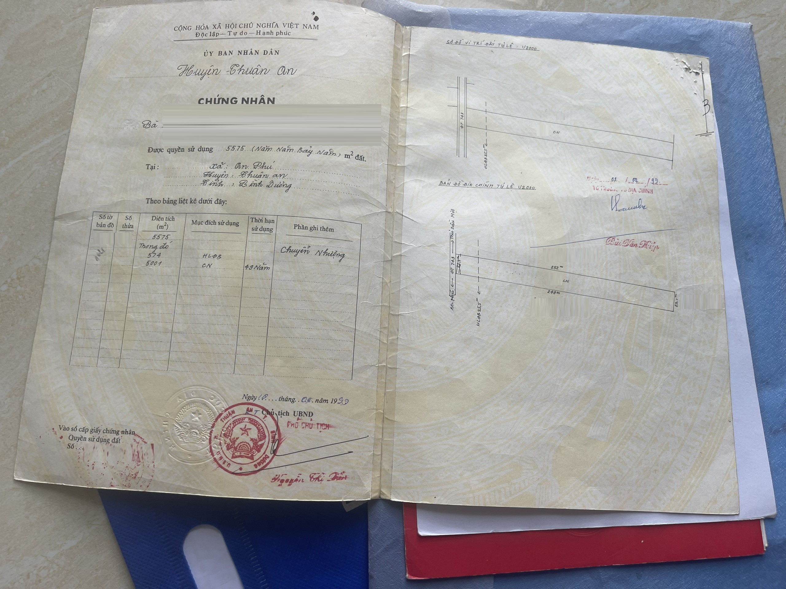 Diện tích đất công nhận: 5575 m2, trong đó 574m2 đất lộ giới, 5001m2 đất trồng cây