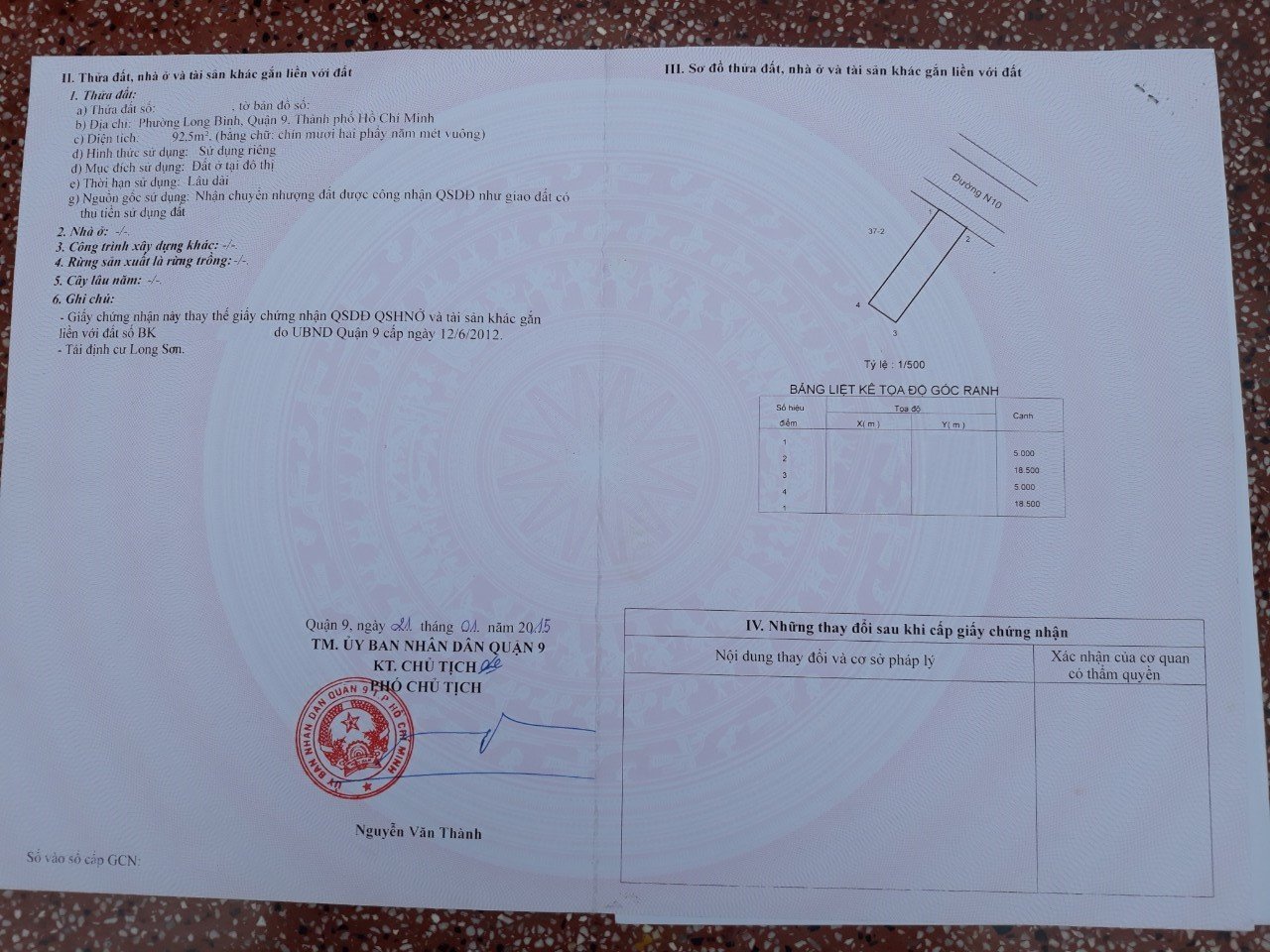 Diện Tích đất công nhận: 92.5 m ngang 5 m x dài 18.5 m