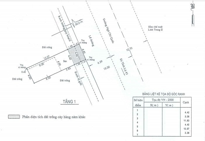 * Diện tích đất: 67.7m2 (ngang 4.42m x dài 12.07m) – đất ở: 52.8m2; đất trồng cây: 14.9m2