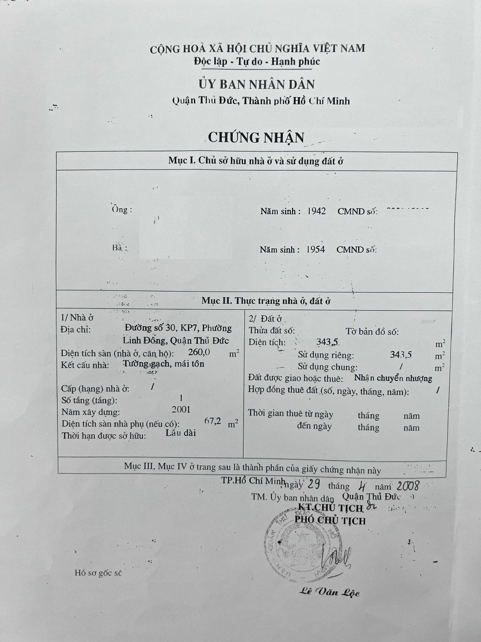 <393LĐ>: Bán đất + nhà cấp 4 Đường số 30, Phường Linh Đông. Đường nhựa xe hơi. Nhà cấp 4. Đang cho thuê 190 triệu/ tháng