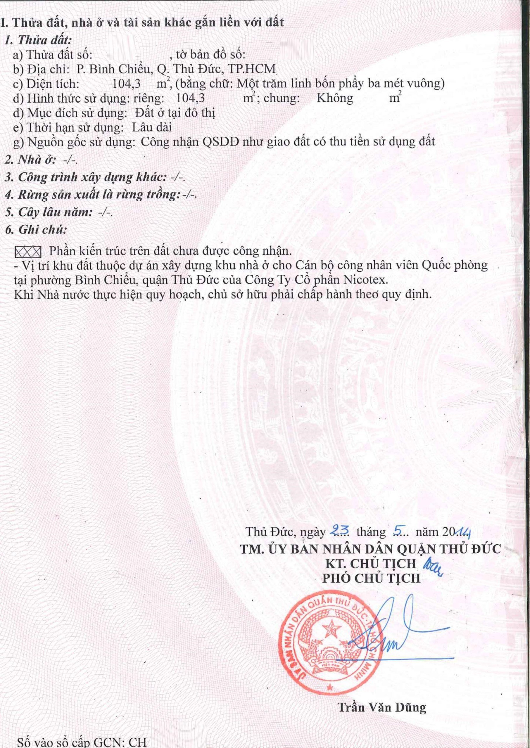 *Diện tích đất công nhận: 104.3m2. Ngang 5m x Dài 20.8m.