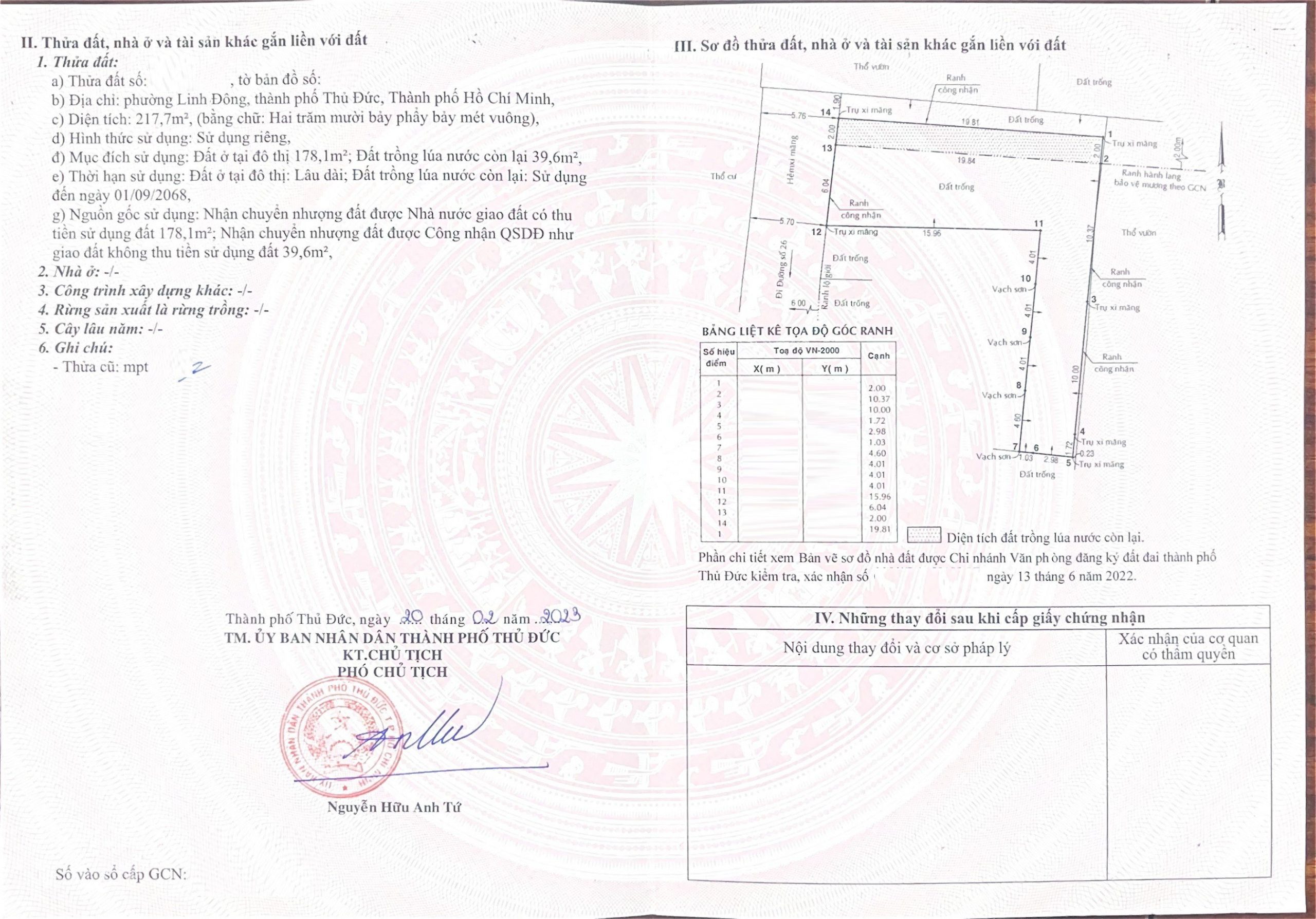 Diện tích: 217.7m², ODT: 178.1m2, Đất lúa 39.6m2