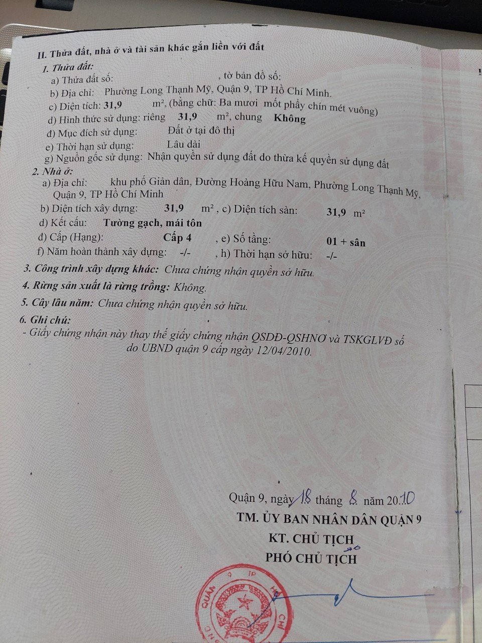 Địa chỉ tài sản: đường Hoàng Hữu Nam ,Phường Long Thạnh Mỹ, Phường Long Thạnh Mỹ, Quận 9, Hồ Chí Minh
