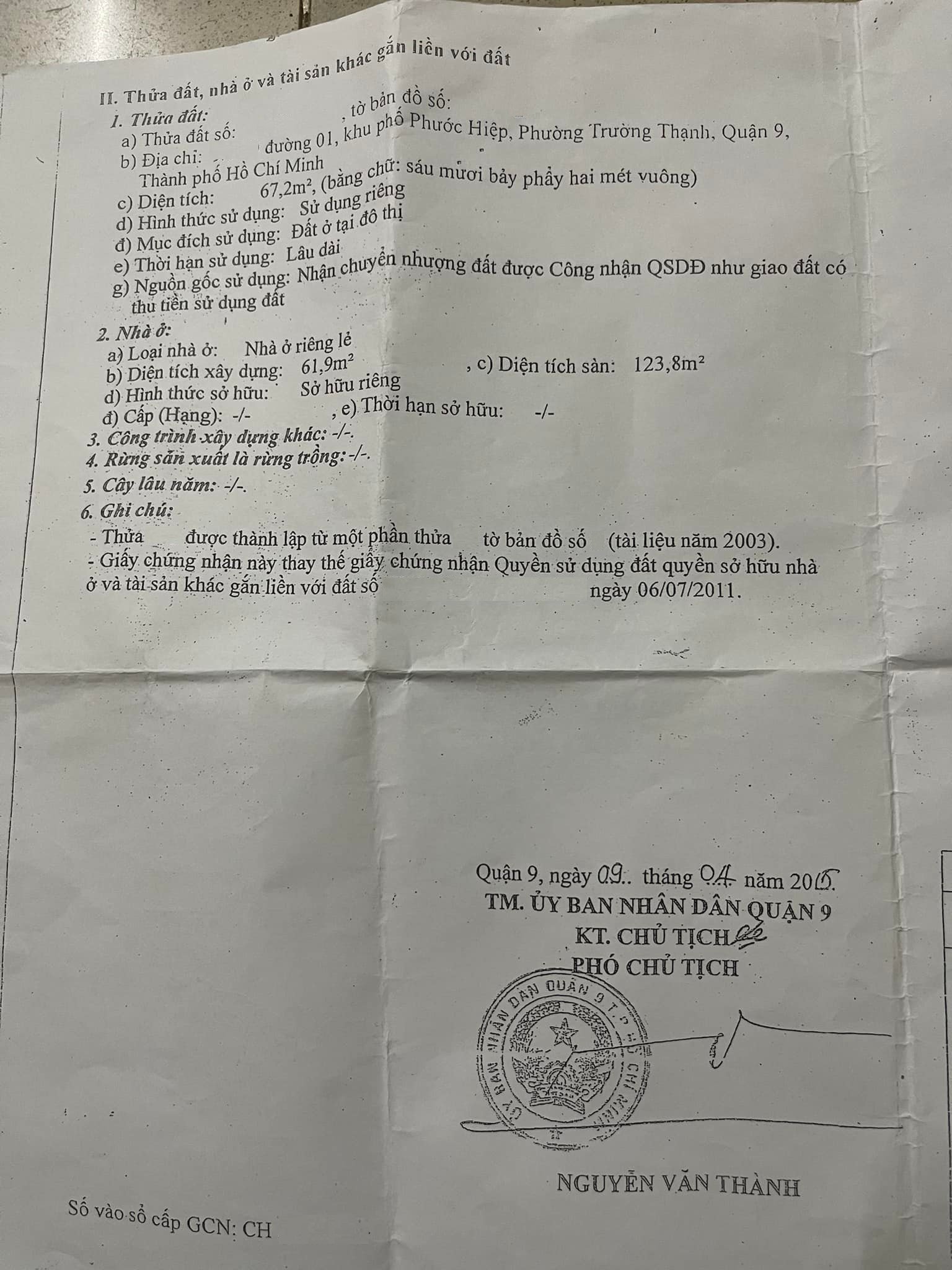 Địa chỉ tài sản: đường 1, Phường Trường Thạnh, Phường Trường Thạnh, Quận 9, Hồ Chí Minh