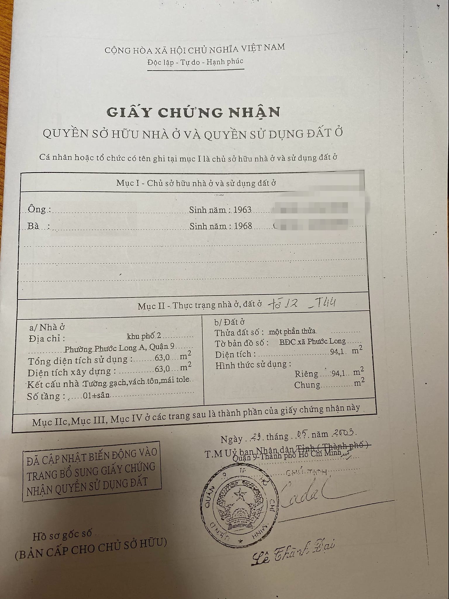 *Diện Tích đất công nhận: 94.1 m2 ngang 4.5 m x dài 20.8 m