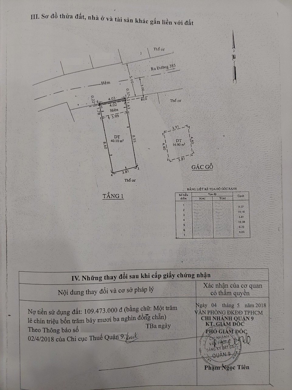 *Diện Tích đất công nhận: 40.1 m2 ngang 4 m x dài 10 m