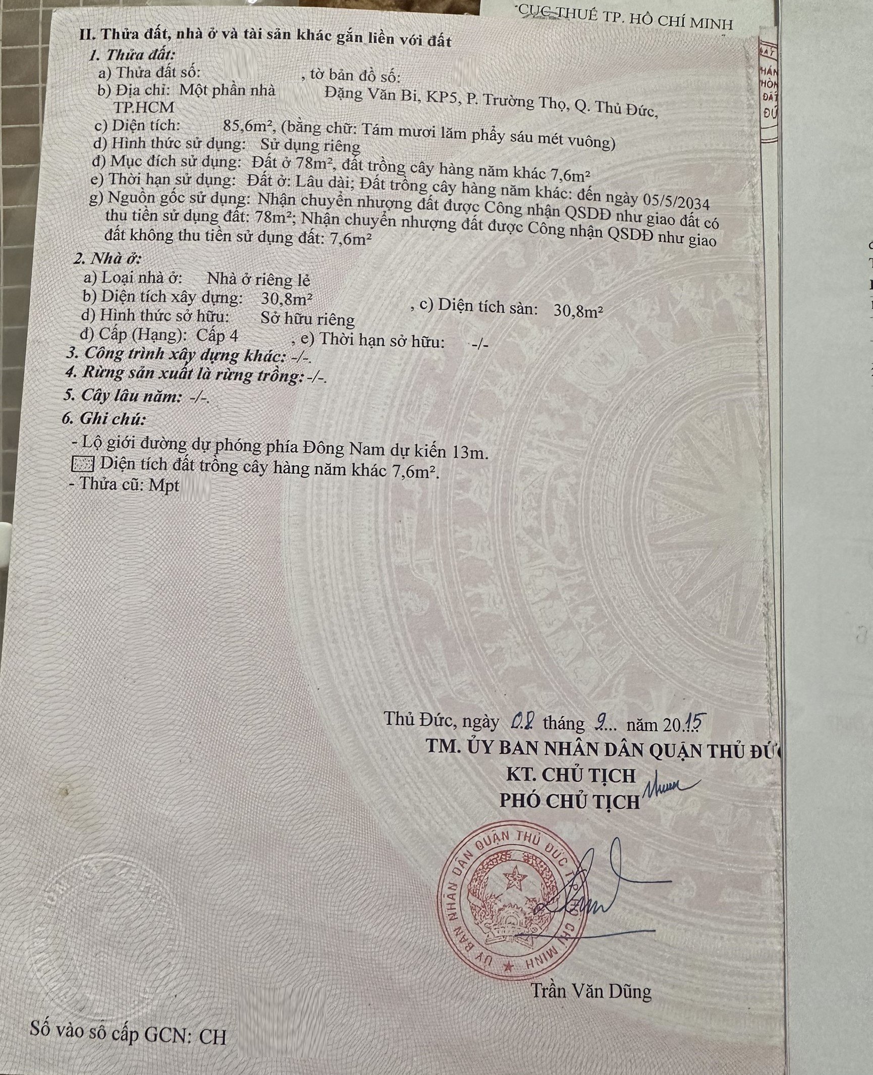 *Diện tích đất công nhận: 85.6m2. Ngang 4.2m x Dài 18.61m. ODT: 78m2, CLN: 7.6m2.