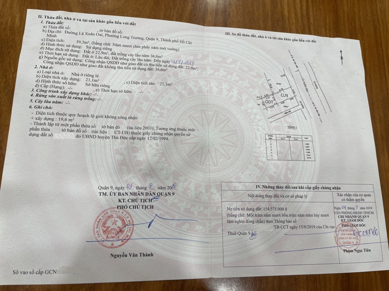 *Diện Tích đất công nhận: 59.5 m2 ngang 4 m hậu 4.2m x dài 14 m Thổ cư 22.9 m2 đất trồng cây 36.6 m2