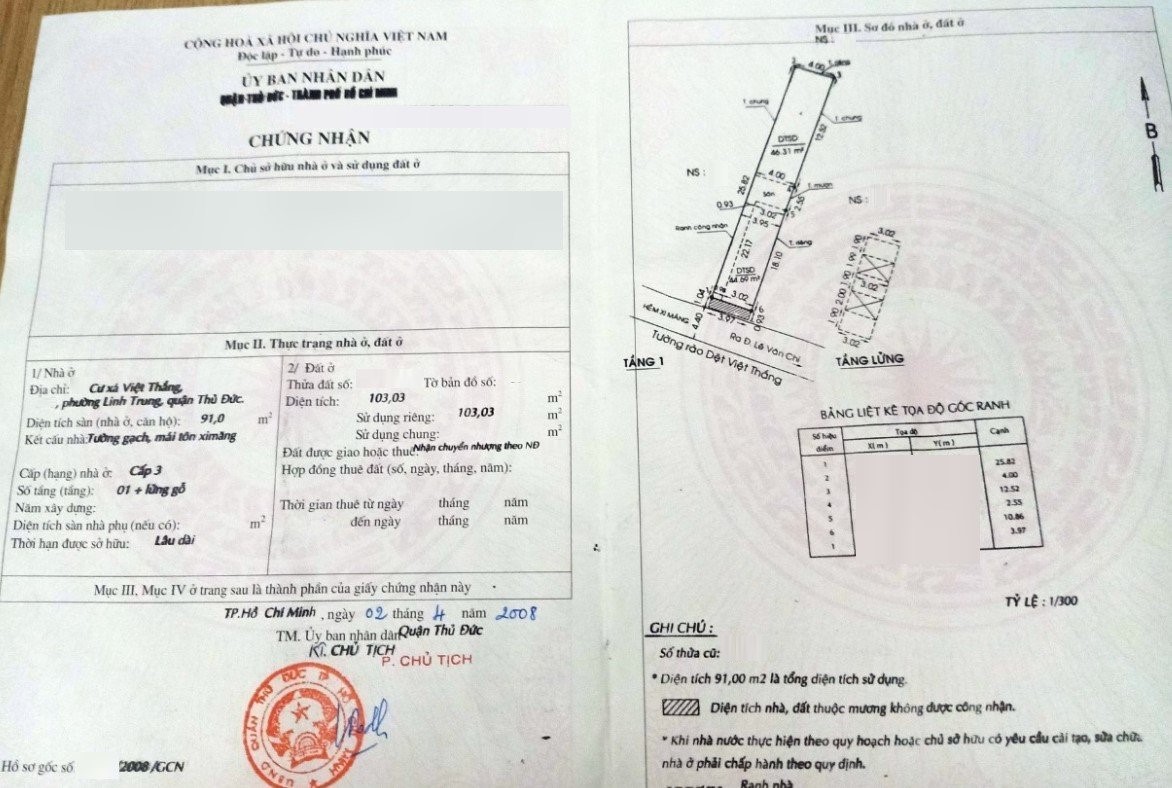 *Diện Tích đất công nhận: 103.03m2 ngang 4m x Dài 26.8m