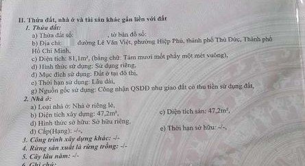 Địa chỉ tài sản: đường Lê Văn Việt, phường Hiệp Phú, TP Thủ Đức., Phường Hiệp Phú, Quận 9, Hồ Chí Minh