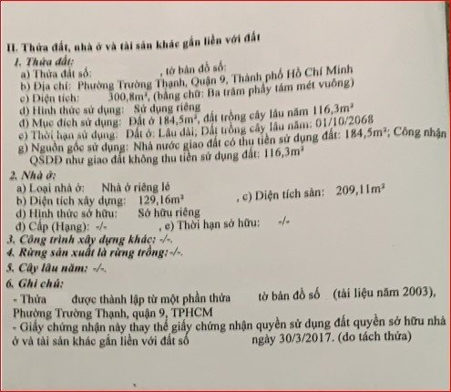 *Diện Tích đất công nhận: 300.8 m2 ngang 9 m x dài 33 m ODT: 184.5m2, DTC: 116.3 m2