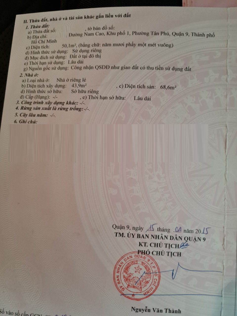 Địa chỉ tài sản: đường Nam Cao, Phường Tân Phú, Phường Tân Phú, Quận 9, Hồ Chí Minh