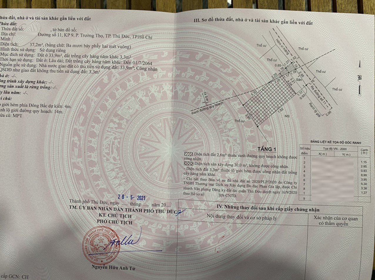 *Diện tích đất công nhận: 37.2m2. Ngang 4.1m x Dài 9.99m. ODT: 33.9m2, CLN: 3.3m2