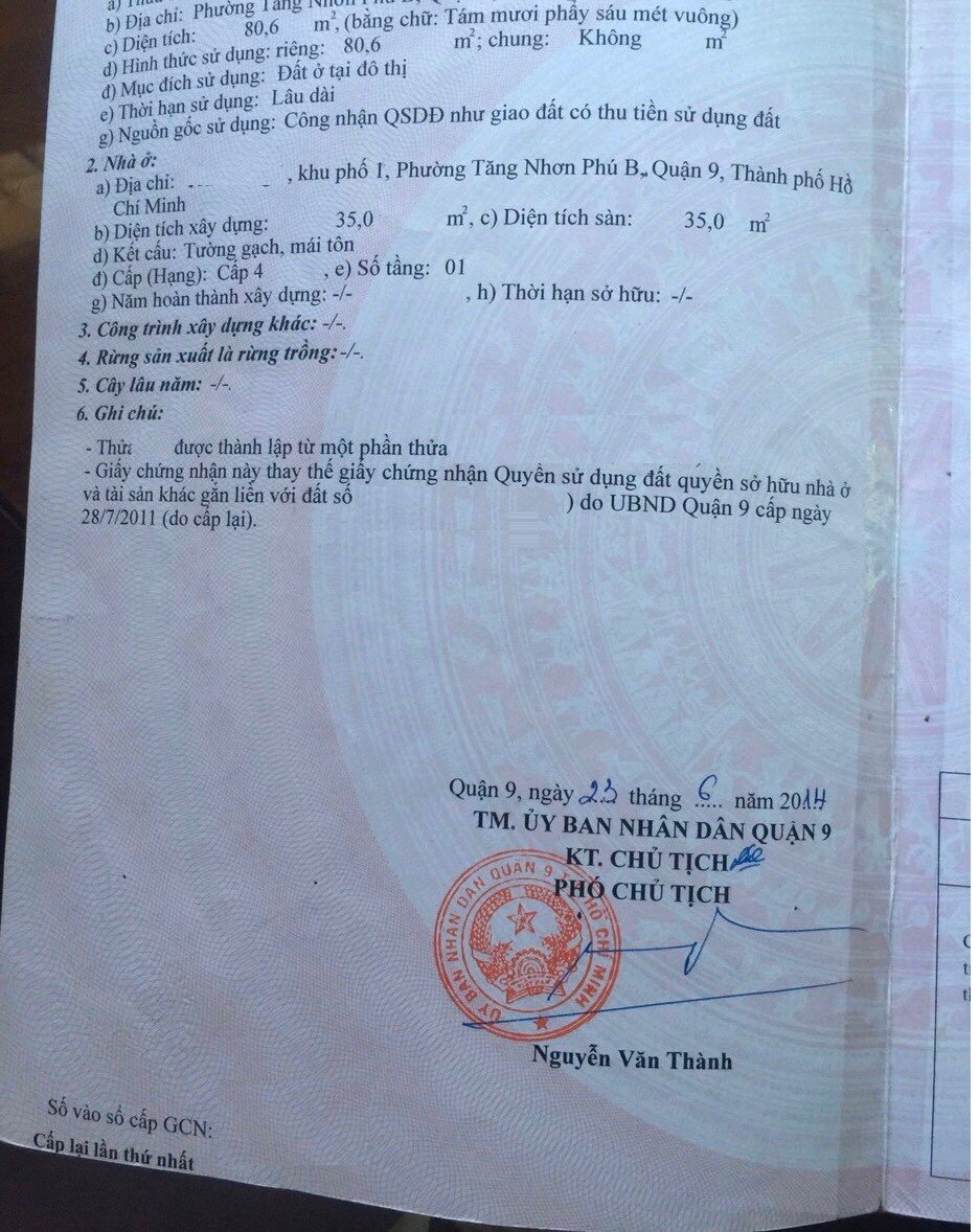 <104TNPB>: Bán nhà, Đường số 2, Phường Tăng Nhơn Phú B. Đường nhựa xe hơi 4m.
