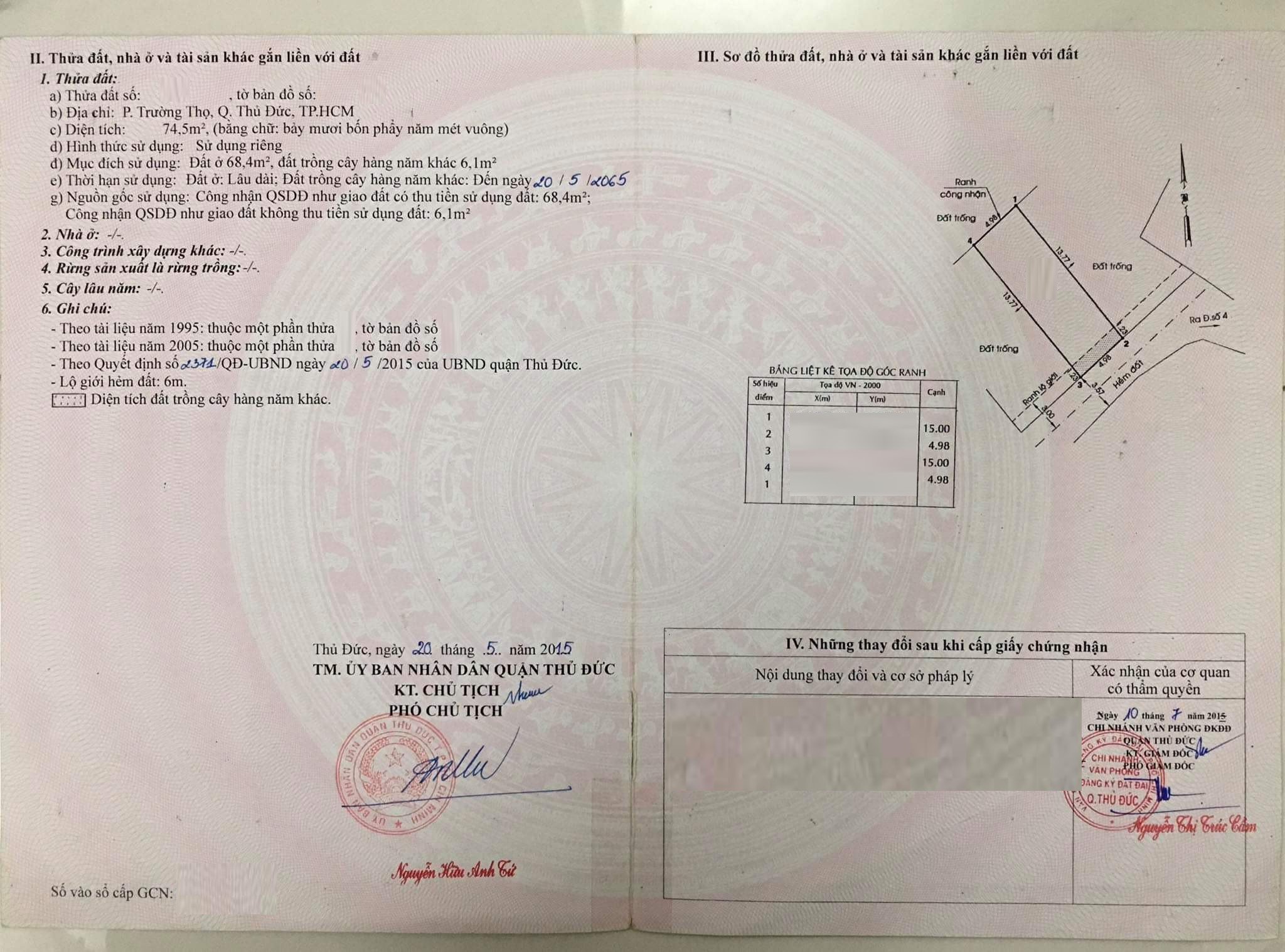 *Diện tích đất công nhận: 74.5m2. Ngang 4.98m x Dài 15m. ODT: 68.4m2, CLN: 6.1m2.