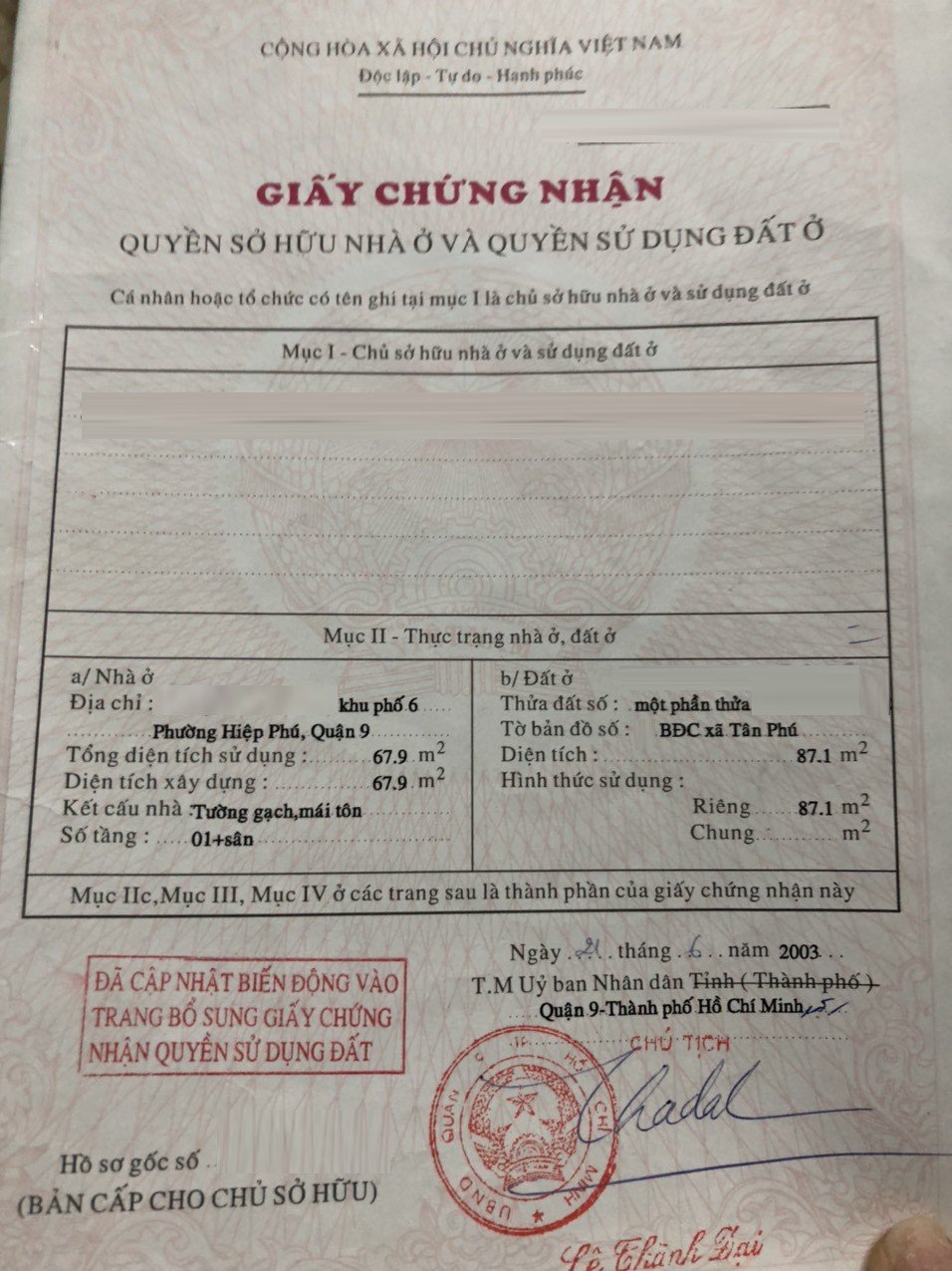 Địa chỉ tài sản: đường Tân Hóa 2, phường Hiệp Phú, Phường Hiệp Phú, Quận 9, Hồ Chí Minh