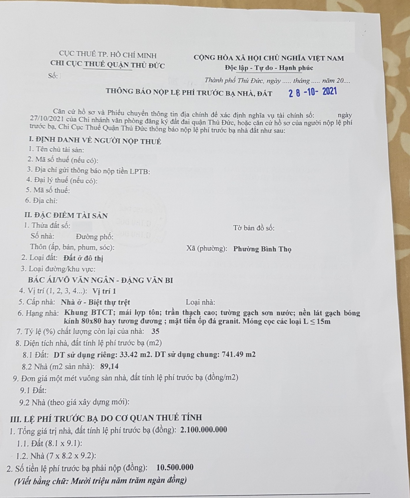 Địa chỉ tài sản: MT đường Bác Ái - Lương Khải Siêu, phường Bình Thọ, Phường Bình Thọ, Quận Thủ Đức, Hồ Chí Minh