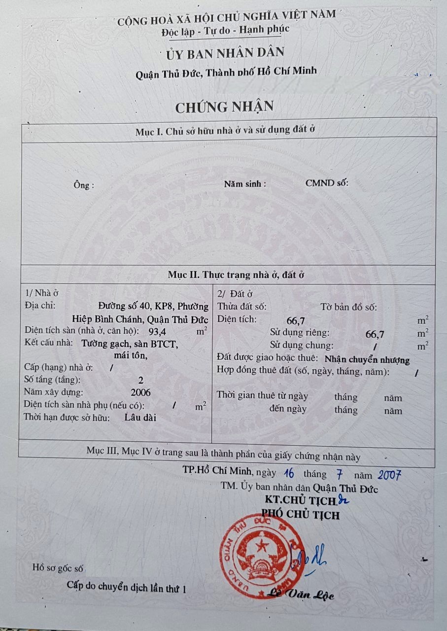Địa chỉ tài sản: hẻm đường 40, Phường HBC, Phường Hiệp Bình Chánh, Quận Thủ Đức, Hồ Chí Minh