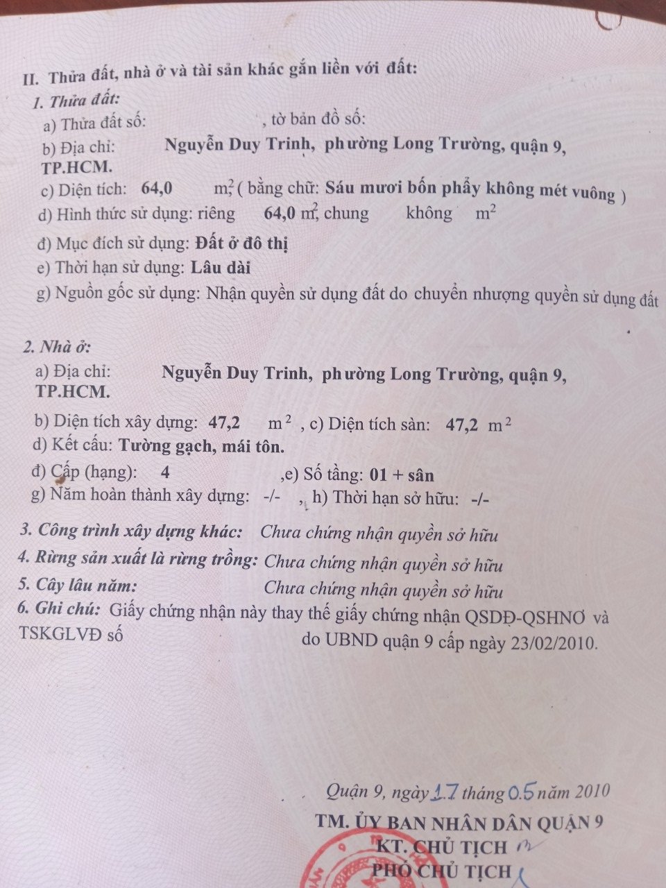 Địa chỉ tài sản: Đường Nguyễn Duy Trinh, Phường Long Trường, Phường Long Trường, Quận 9, Hồ Chí Minh