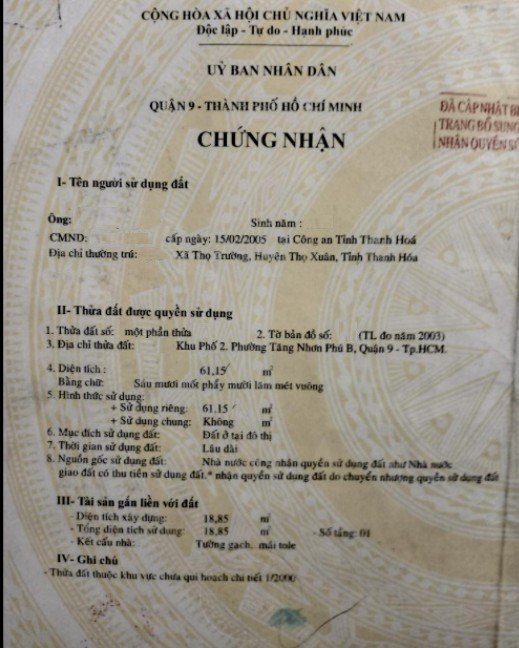 Địa chỉ tài sản: đường Quang Trung, Phường Tăng Nhơn Phú B, Phường Tăng Nhơn Phú B, Quận 9, Hồ Chí Minh