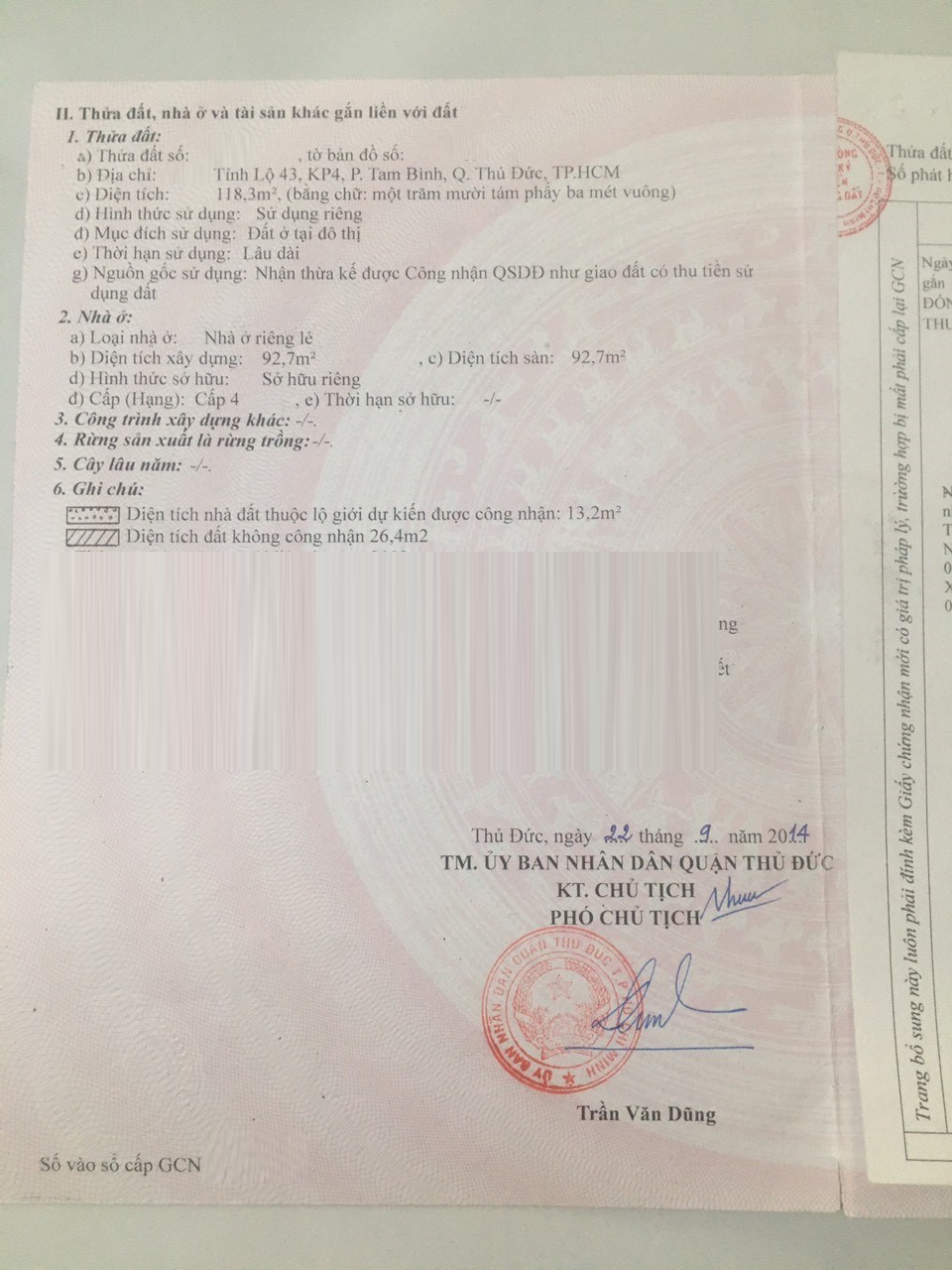 – Diện tích đất công nhận: 118.3m2. Ngang 6.3m x Dài 18m