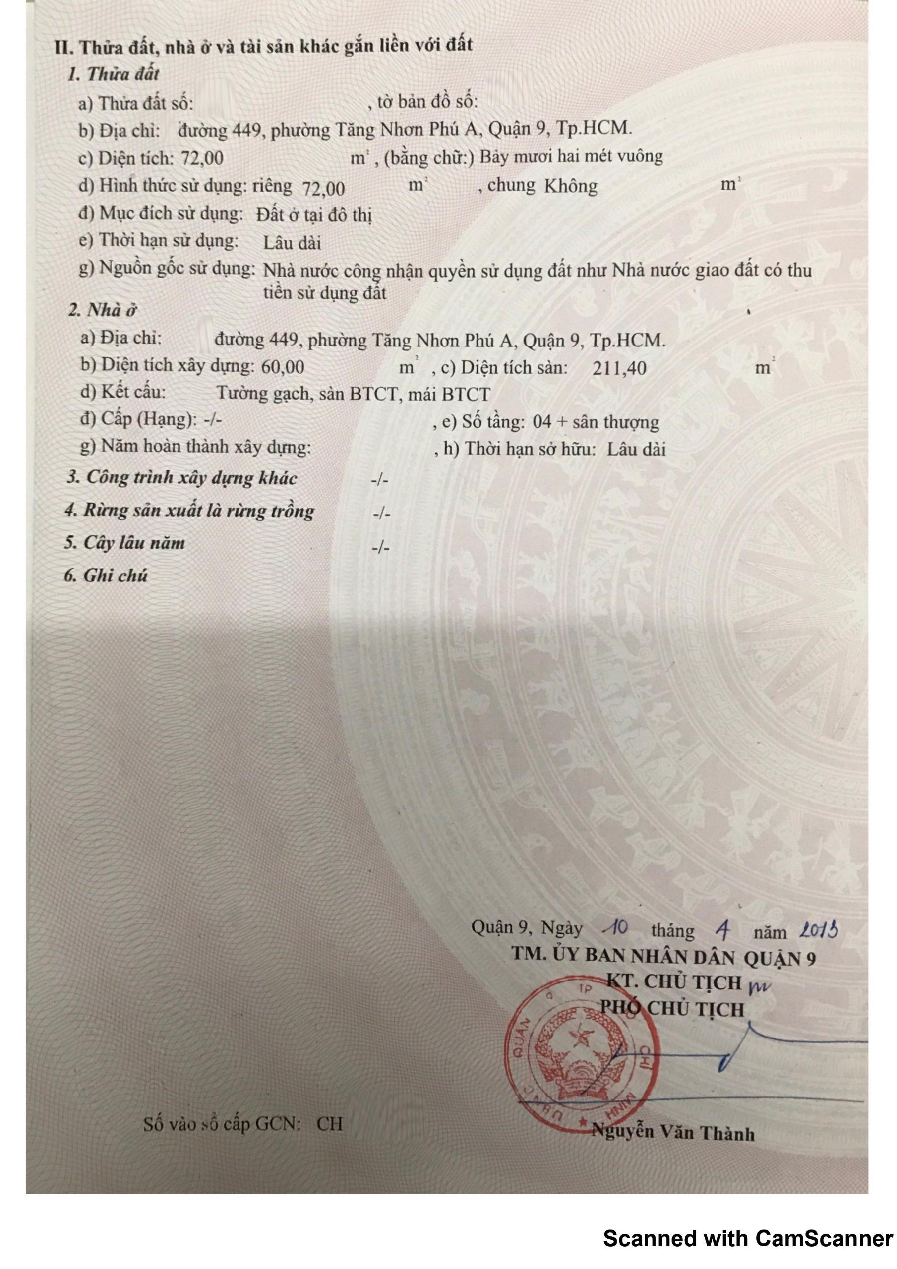 Địa chỉ tài sản: mặt tiền đường 449, Phường Tăng Nhơn Phú A, Phường Tăng Nhơn Phú A, Quận 9, Hồ Chí Minh
