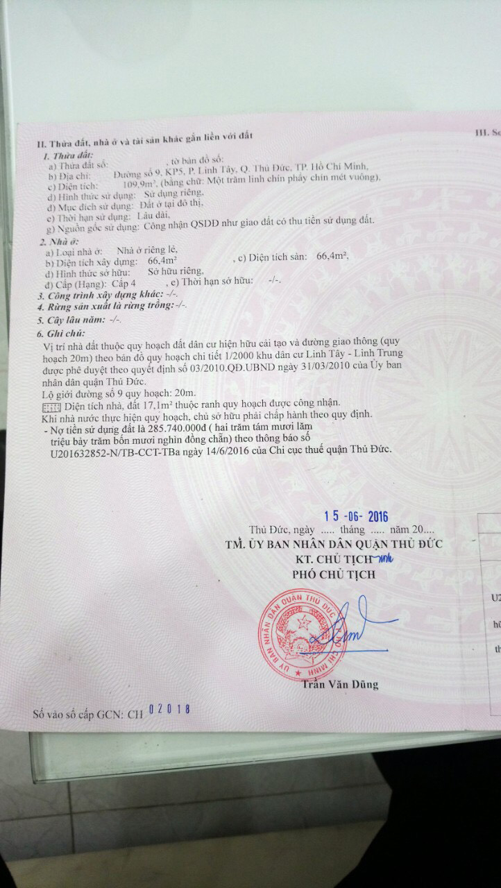 <2016LT> Bán nhà MẶT TIỀN đường 9, P Linh Tây.Q Thủ Đức. DT: 109.9m