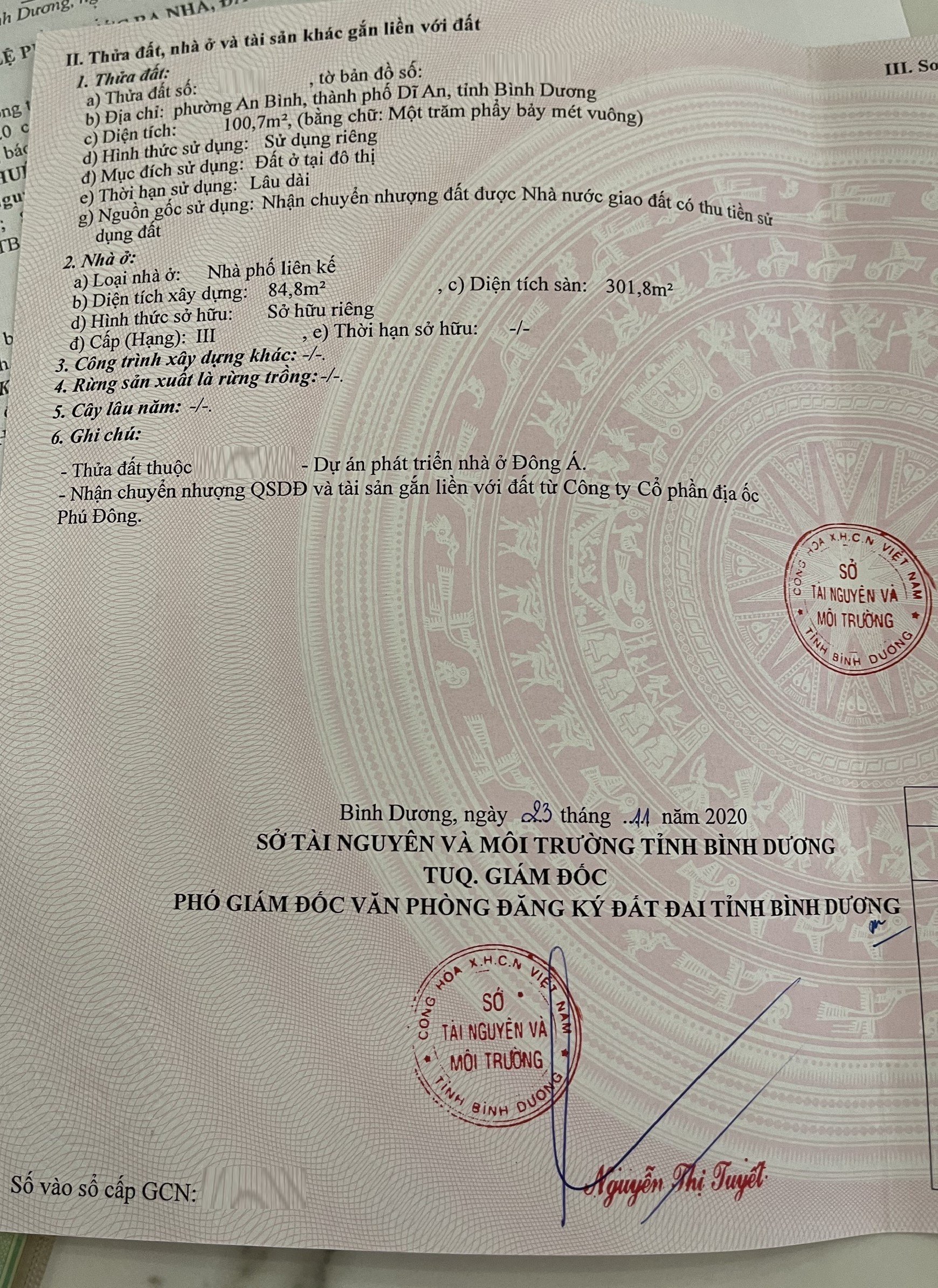 *Diện Tích đất công nhận: 100.7 m2 ngang 5 m x dài m ODT: m2 CLN: m2