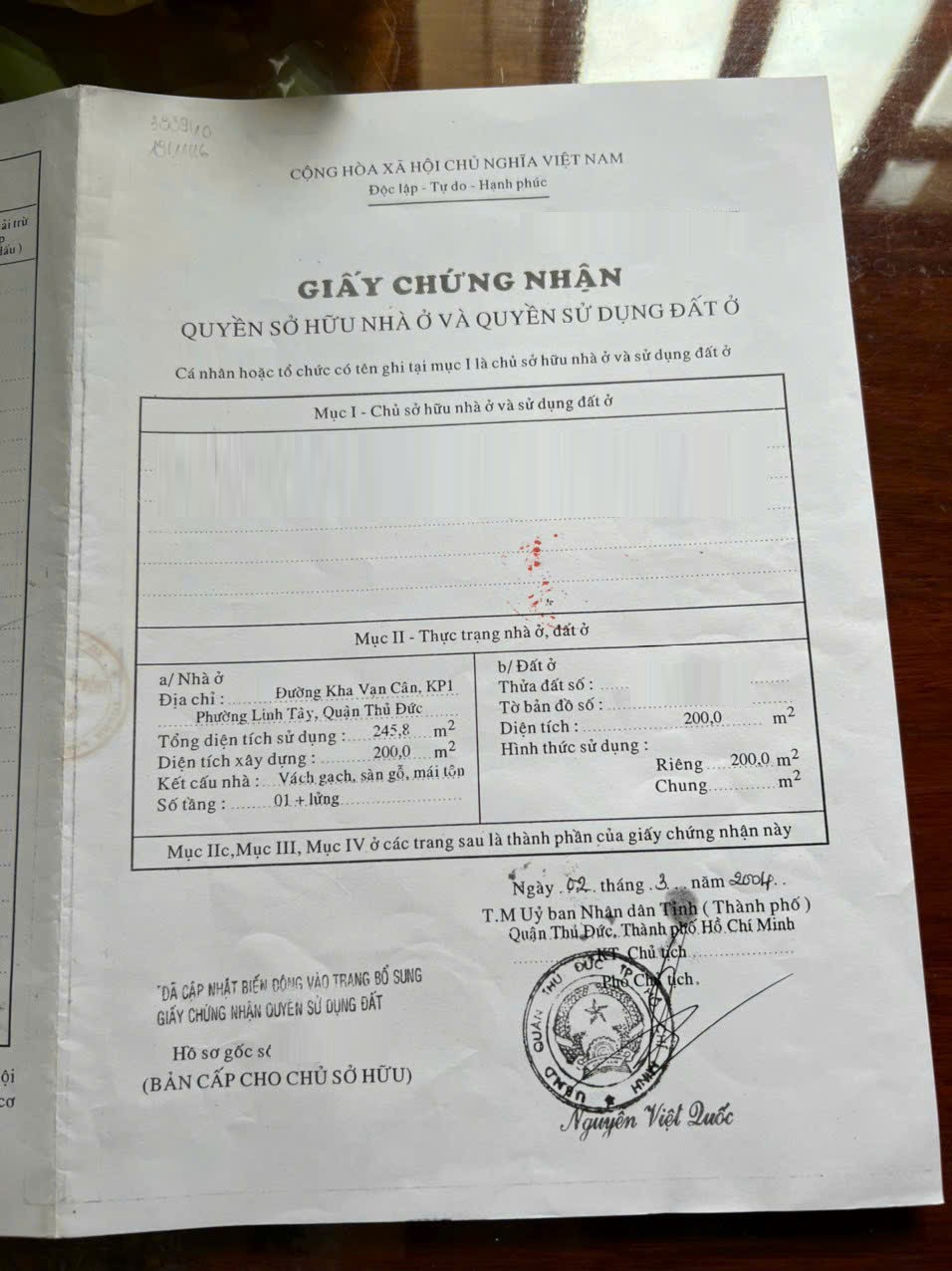 Sổ 1: 100.8 m2 ngang 3.26m x dài 30.9m