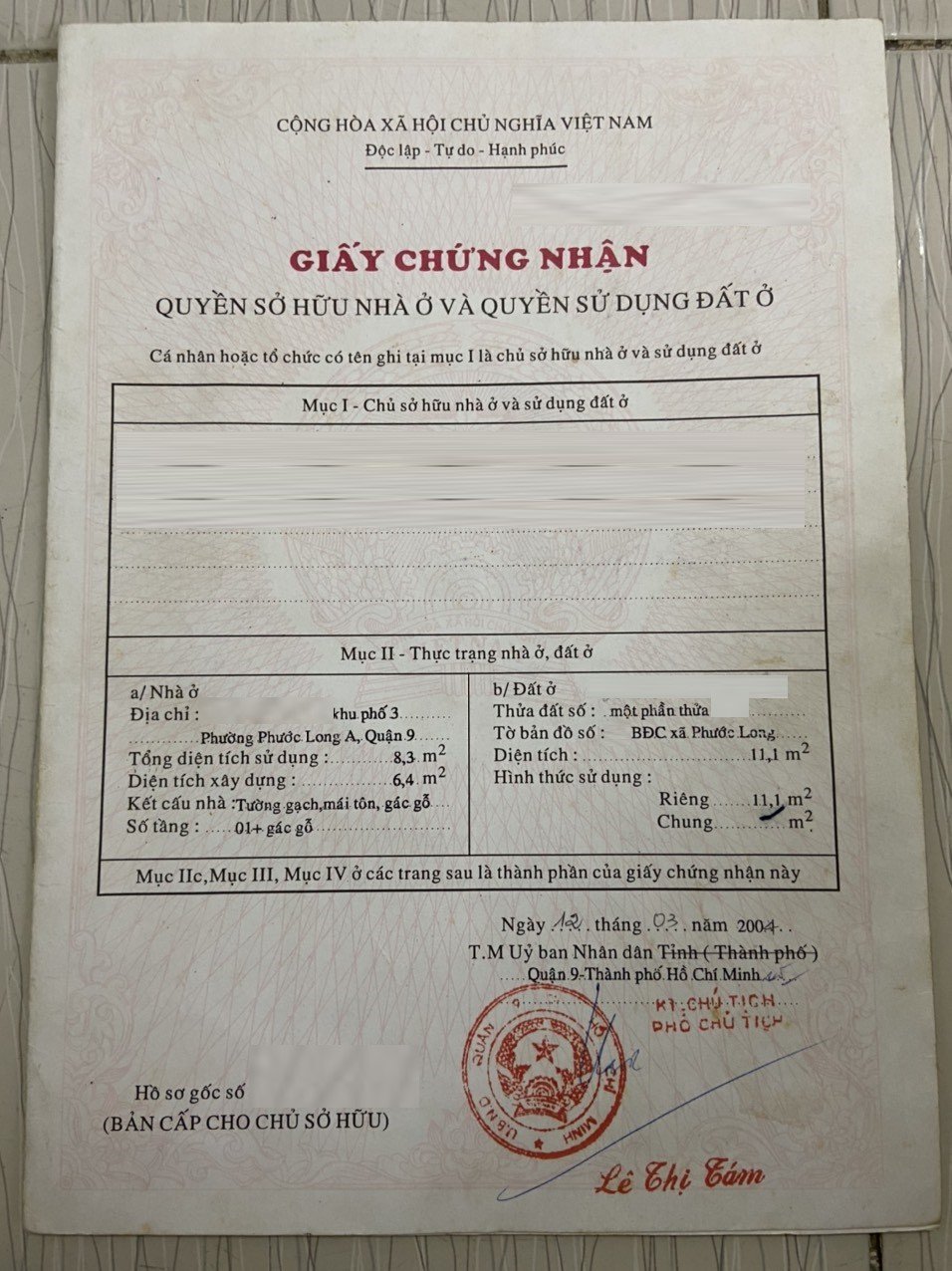*Diện tích đất công nhận: 11.1m2. Ngang 3m x Dài 7m. Chưa hoàn công.