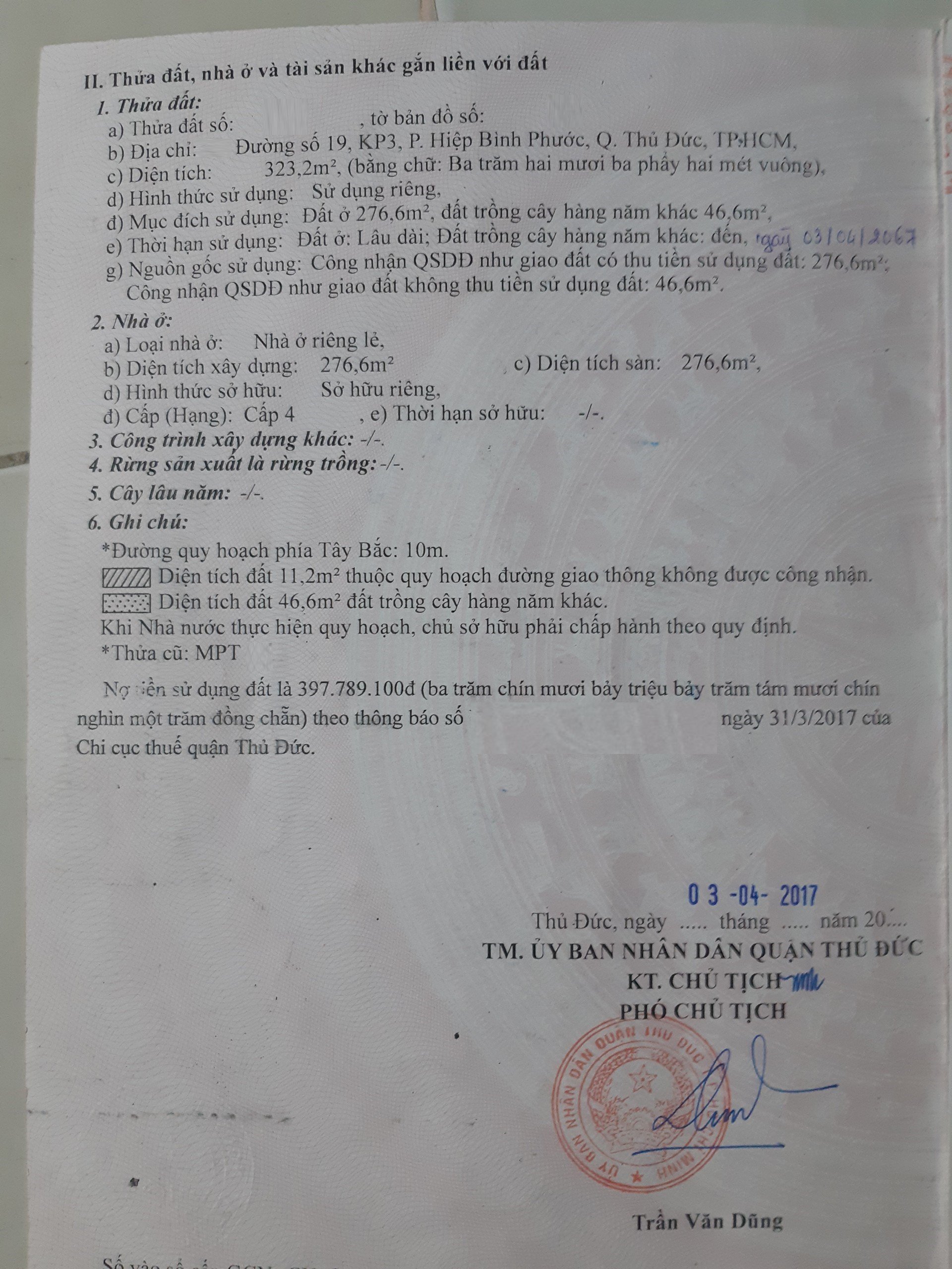 *Diện tích đất công nhận: 323.2m2. Ngang 2.81m x Dài 39m. Nở hậu 11.7m. ODT: 276.6m2, CLN: 46.6m2