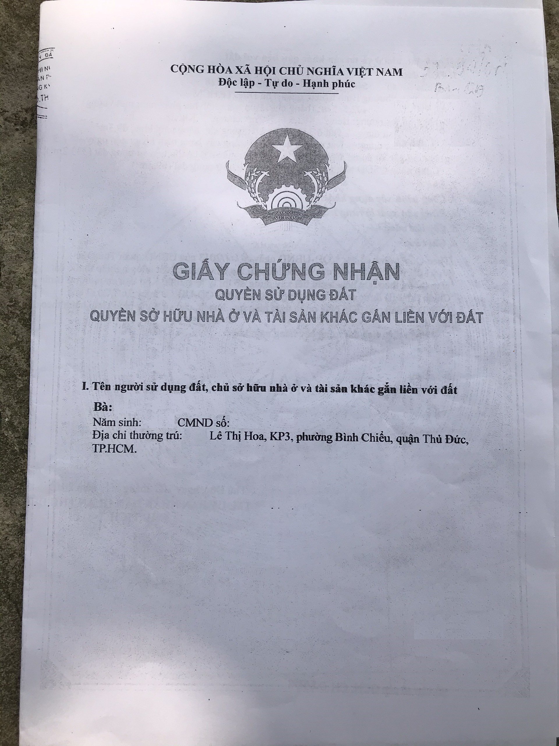 Địa chỉ tài sản: đường Lê Thị Hoa ,Phường Bình Chiểu, Phường Bình Chiểu, Quận Thủ Đức, Hồ Chí Minh