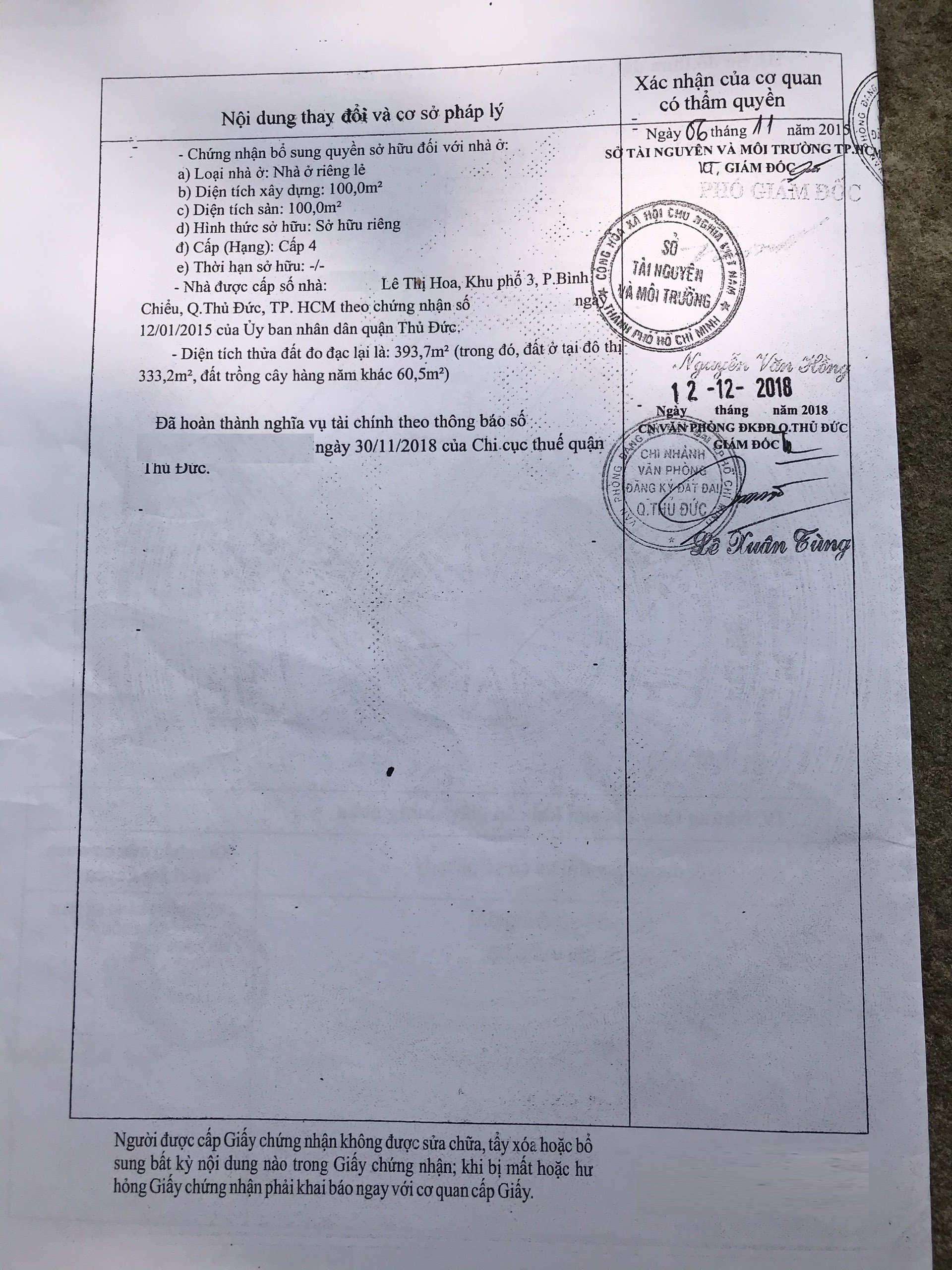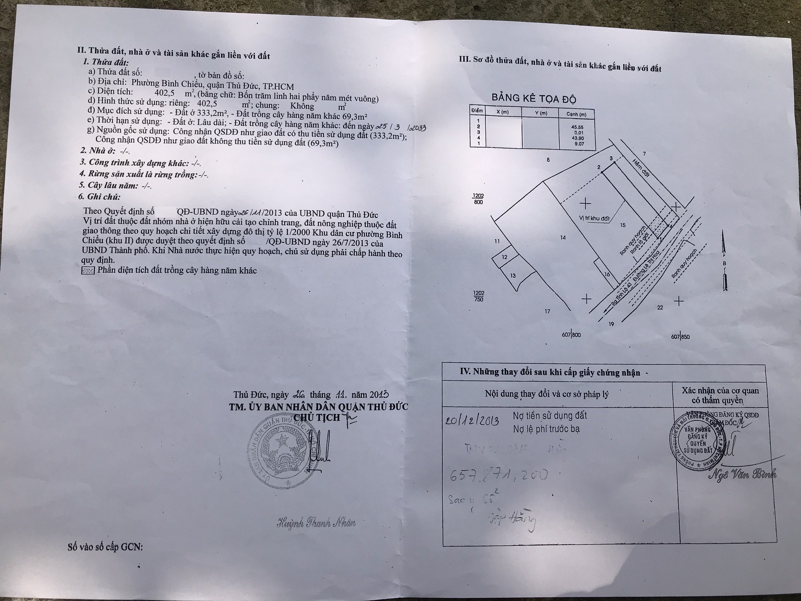 Diện tích đất sử dụng: 393.7m2 Thổ cư 333.2m2 đất trồng cây 60.5m2
