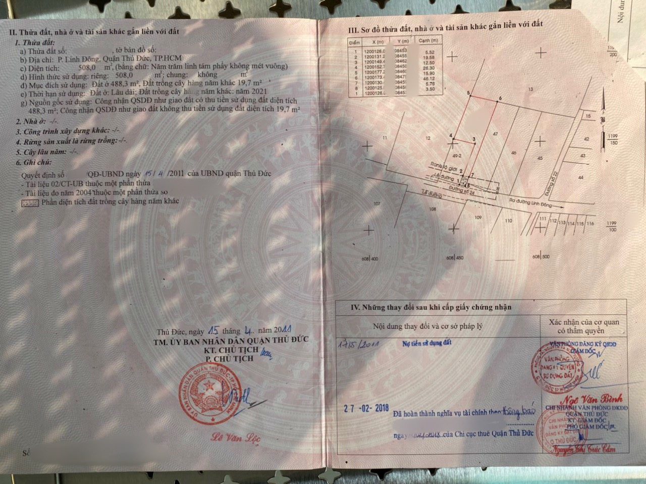 *Diện Tích đất công nhận: 508m2 ODT: 488,3 m2 đất trông cây 19,7m2