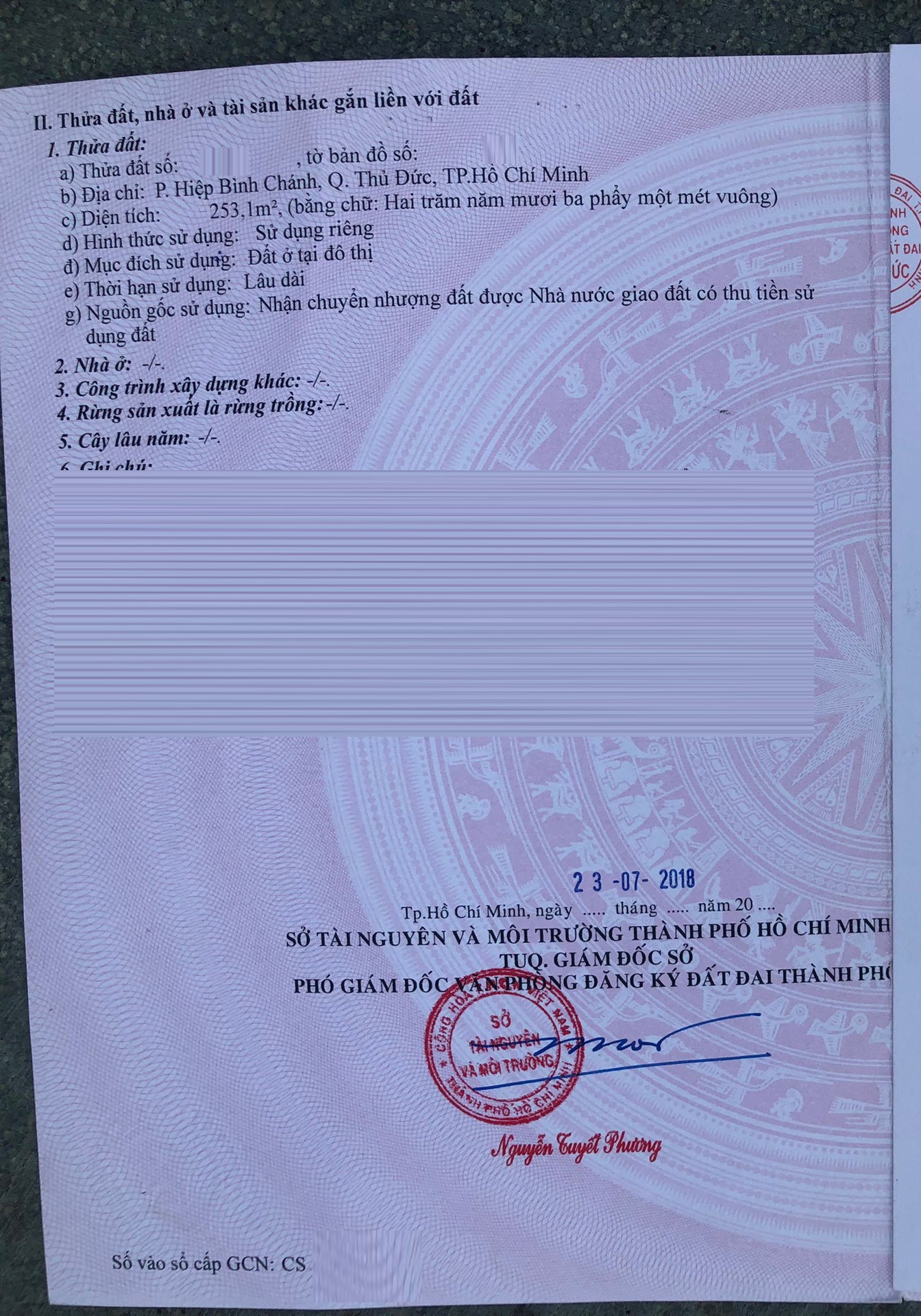Diện tích đất công nhận: 253.m2 ngang 17m x 15m