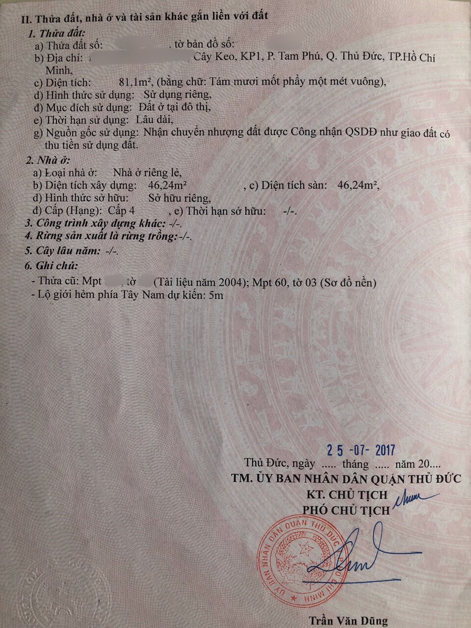 Địa chỉ tài sản: hẻm đường Cây Keo, Phường Tam Phú, Quận Thủ Đức, Hồ Chí Minh